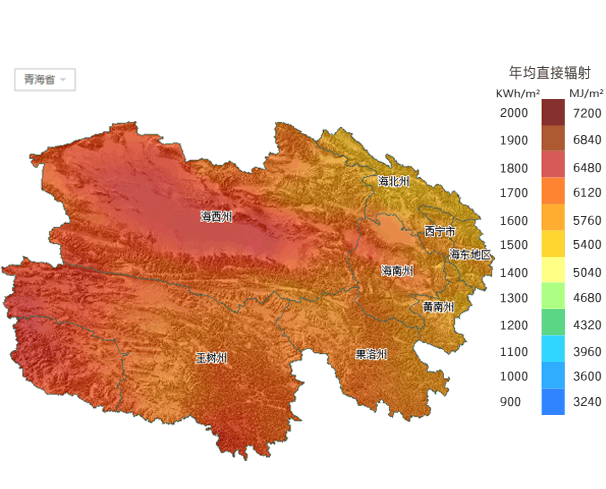 青海地处高原地区,太阳辐射强度大,光照时间长,年总辐射量每平方厘米可达690.8~753.6千焦耳,直接辐射量占辐射量的60%以上,年绝对值超过418.68千焦耳,仅次于西藏,位居中国第二。