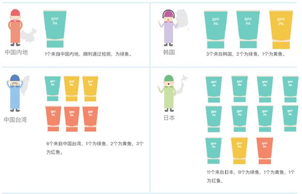 “小鱼亲测”检测结果显示,于51个防晒霜样本当中,16个样本显示为绿鱼(代表质量卓越)、8个样本为黄鱼(代表基本合格),27个样本为红鱼(代表有待改善)。