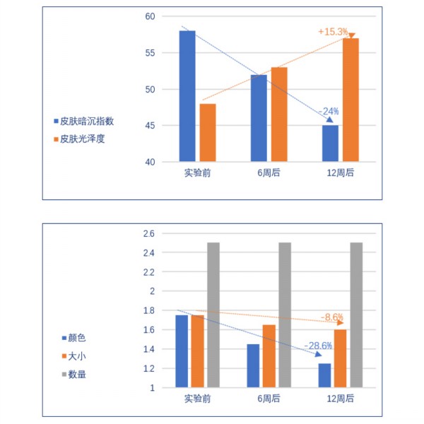 研究为期90天,以22-55岁脸色暗黄、有黑斑的亚洲女性为测试对象。经过12周后,发现受测对象的皮肤暗沉度降低了24%,皮肤光泽度则提升了15.3%,展现了惊人的亮白功效,且未发现任何过敏、刺激等现象。与此对应的,面部黑斑的颜色和大小也出现了显著的降低,斑痕色度减淡了28.6%,大小则降低了8.6%。
