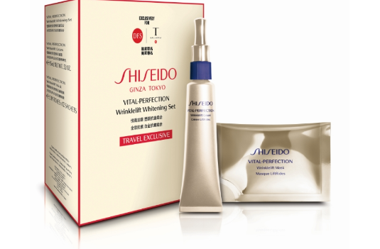 · 选购DFS独家呈献资生堂Vital Perfection Wrinkle Lift美白套装,可享9折优惠。消费满港币1,300元或以上,即可获赠奢华旅行套装5件套(价值港币540元)。