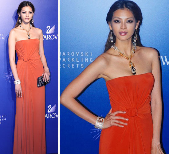 台湾名模林嘉綺一袭橙色裹胸贴身长裙高调登场,长发向耳际后靠拢,露出女人味十足的长款项链,裹胸裙装也饶有心机地展露事业线的同时,把性感锁骨呈现出来,光滑细腻的颈部当然缺少不了花朵形状的项链所点缀,闪闪发光的银色宽手镯+黑色亮片手包加分不少,她的这身打扮性感撩人,令现场粉丝大呼过瘾。