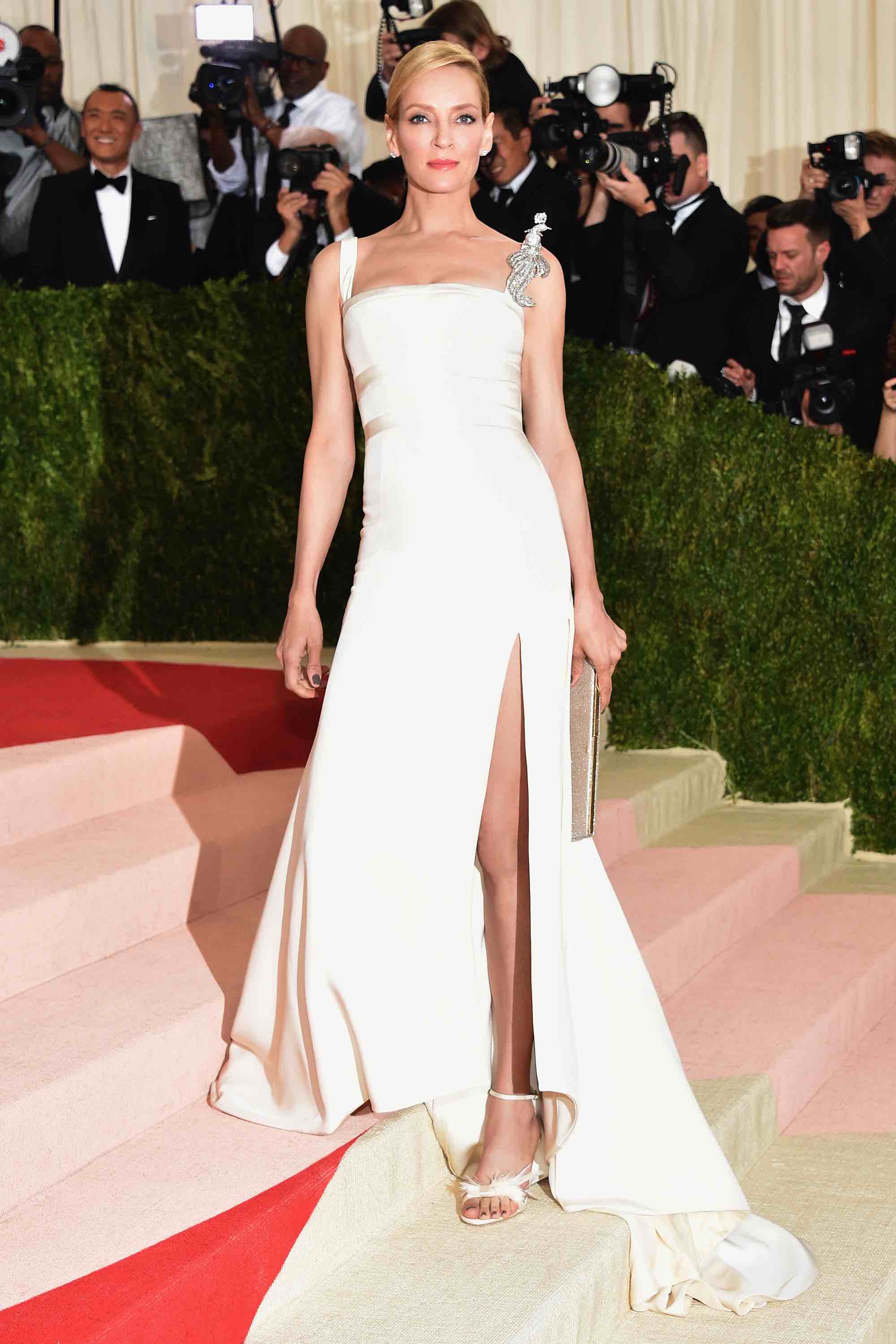 Uma Thurman小姐,身着高级定制款象牙白连衣裙,背部低腰设计,高开叉,并有皮质肩带细节。