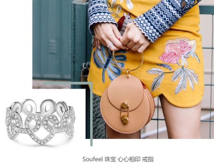 作为Soufeel今年的时尚爆款,Logo系列的饰品得到了众多女星的青睐,当然,娜扎对我们的logo系列也是钟爱有加。民族风镂空上衣与刺绣花纹的裙装的组合,搭配Solufeel logo系列戒指,简单干练的却又不失精致。