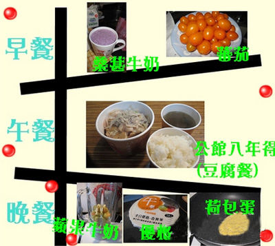 早上吃桑甚打牛奶,有很漂亮的颜色!桑甚富含很多铁质,所以女生闷吃了气色很好,也是排毒盛品,橘色的又称为减肥番茄哟。在减肥时,虽然要少吃肉,糖,淀粉,以及脂肪,但不可或缺的就是“蛋白质”,豆腐和荷包蛋就来补充蛋白质吧。