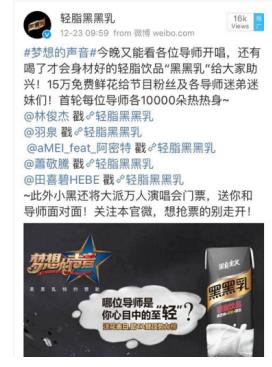 《梦想的声音》定位于大型原创音乐类节目,其创新的“星素讨教”形式获得粉丝好评。作为国内首款“轻脂饮品”,黑黑乳追求创新的理念和《梦想的声音》完美契合,因此每一次活动黑黑乳都秉持创新的精神,今年大动作更是接二连三,打造了“黑广告”、915轻脂日、1010京东轻脂节等大型互动活动。12月23日的活动更是开启了微博全国首个动态视频开机大屏,炫酷造型收到网友一致认可。另外,品牌鲜花赠送活动,以及在节目中的海量露出,让黑黑乳在当天赚足了眼球!回顾过往几期《梦想的声音》,黑黑乳在节目中爆点十足,几乎成为导师们在后台的陪伴首选,更通过此次事件,与《梦想的声音》粉丝进行了深度互动,得到了更多粉丝的喜爱!黑黑乳通过与《梦想的声音》携手合作打造这场娱乐盛宴,有效地助推了节目娱乐性和社交属性。