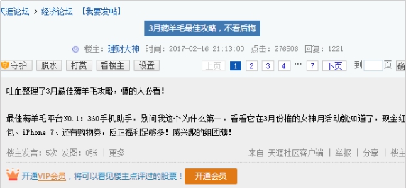 来源:女性伊网 编辑:飞 点击: 次日期:2017-03-06近日,一份《3月薅羊毛最佳攻略》在各大论坛热传。从这份薅羊毛攻略中可以看到,羊毛党们预测,在今年3月最佳薅羊毛的平台是360手机助手,其原因在于360手机助手将在3月3日正式上