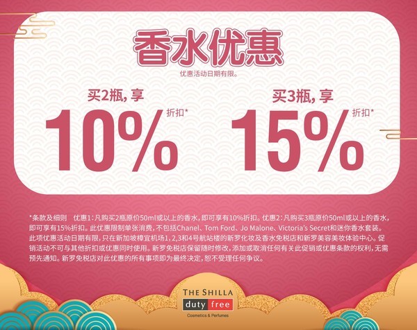新加坡新罗免税店在樟宜机场共设 23 家化妆品与香水店,多达 140 个化妆品与香水品牌,遍布四个航站楼不仅价格比新加坡市区优惠高达六折,新罗更是在农历新年期间,为中国游客特设专属购物优惠,凡购买2瓶香水以上,即可享有10%至15%的折扣,多家国际品牌更是提供春节体验服务给到消费者贵宾如至的享受。