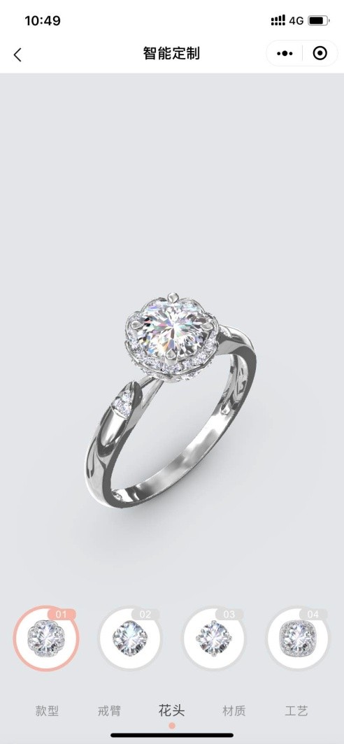 更让大家津津乐道的是,这样一款亲手设计的钻戒,消费者通过一款小程序即可实现。在“钻石小鸟婚戒大师”3D定制小程序中,消费者可通过线上智能服务自由定制自己喜爱的钻戒款式,并可以融入专属元素,如指纹、文字等,让每一钻戒都拥有属于自己独一无二的“印记”。