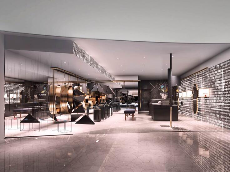 在9号厅进口处的长扶梯向下俯瞰, ONE JEWELRY的展区一定能最先吸引你的眼球: 黑色长方形展区,半封闭、简约大气的设计理念以及与内部品牌相呼应的外部橱窗。